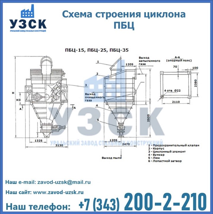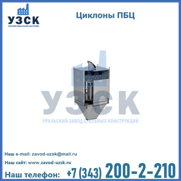 Завод «УЗСК» в Пензе предлагает приобрести циклоны ПБЦ и прочие устройства, полностью укомплектованные и готовые к эксплуатации. Мы гарантируем соответствие оборудования всем требованиям ГОСТ и ТУ, износостойкость и высокую производительность предлагаемого оборудования. Уральский Завод Стальных Конструкций изготавливает и продает надежное, эффективное и производительное оборудование, имеющее длительную гарантию и большой эксплуатационный ресурс. Если требуется изготовить циклон нестандартных размеров, то такой вариант выполнения заказа тоже предусмотрен, так как предприятие имеет собственные производственные площади и надежных поставщиков. На все поставляемое или производимое оборудование имеются чертежи и прочая техническая документация. Заказать и купить циклоны или прочее оборудование высокого качества и по доступной цене можно через наш сайт или по указанному в разделе «Контакты» телефону.